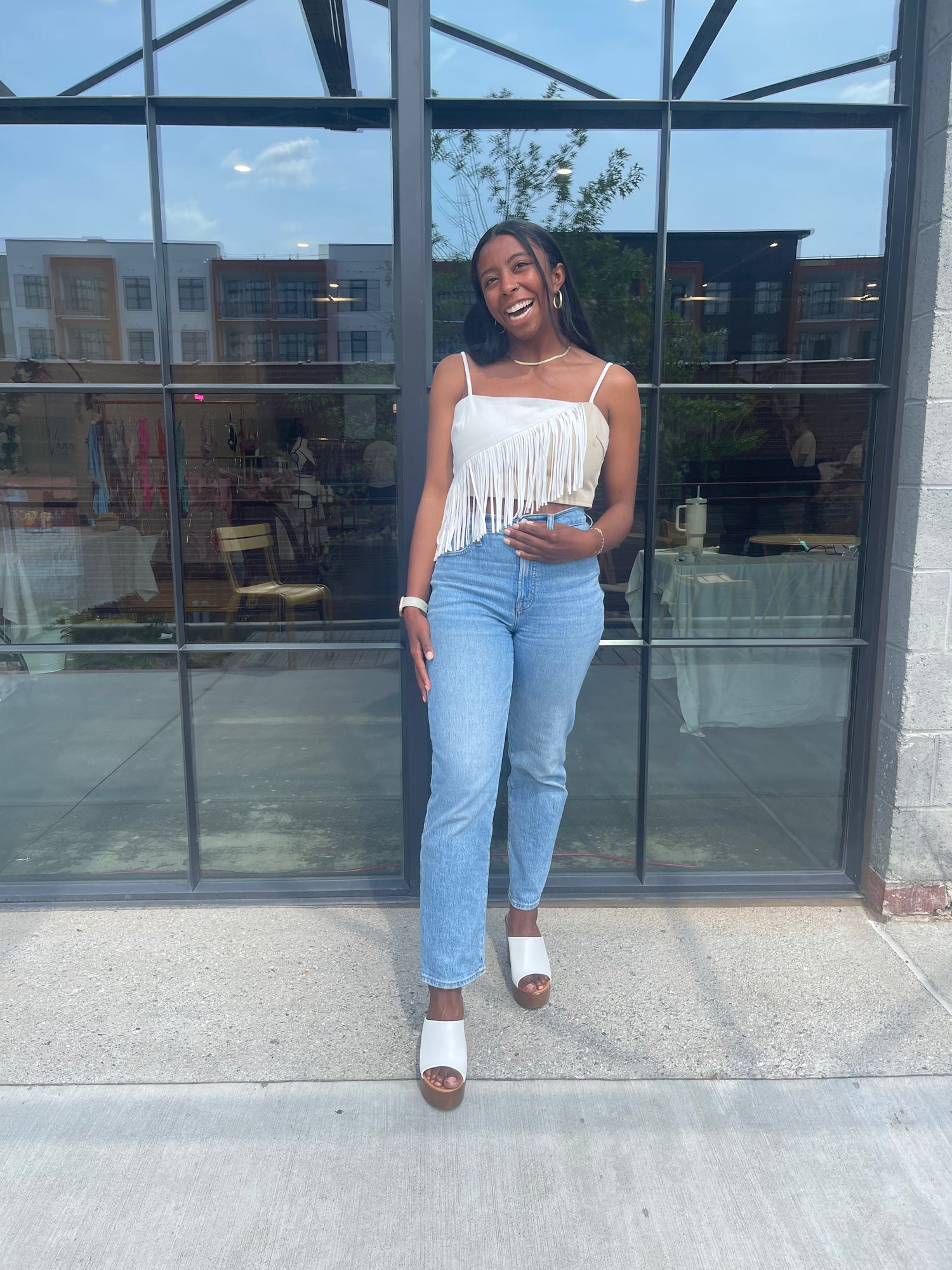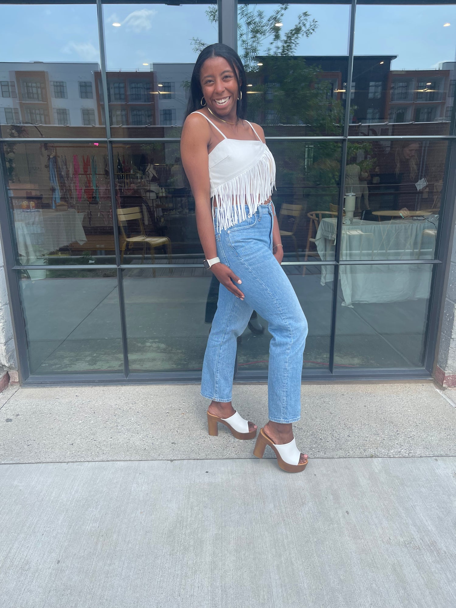 A lightweight combination of white and taupe denim. Accentuated with adjustable straps, a back zipper closure and fringe detailing.