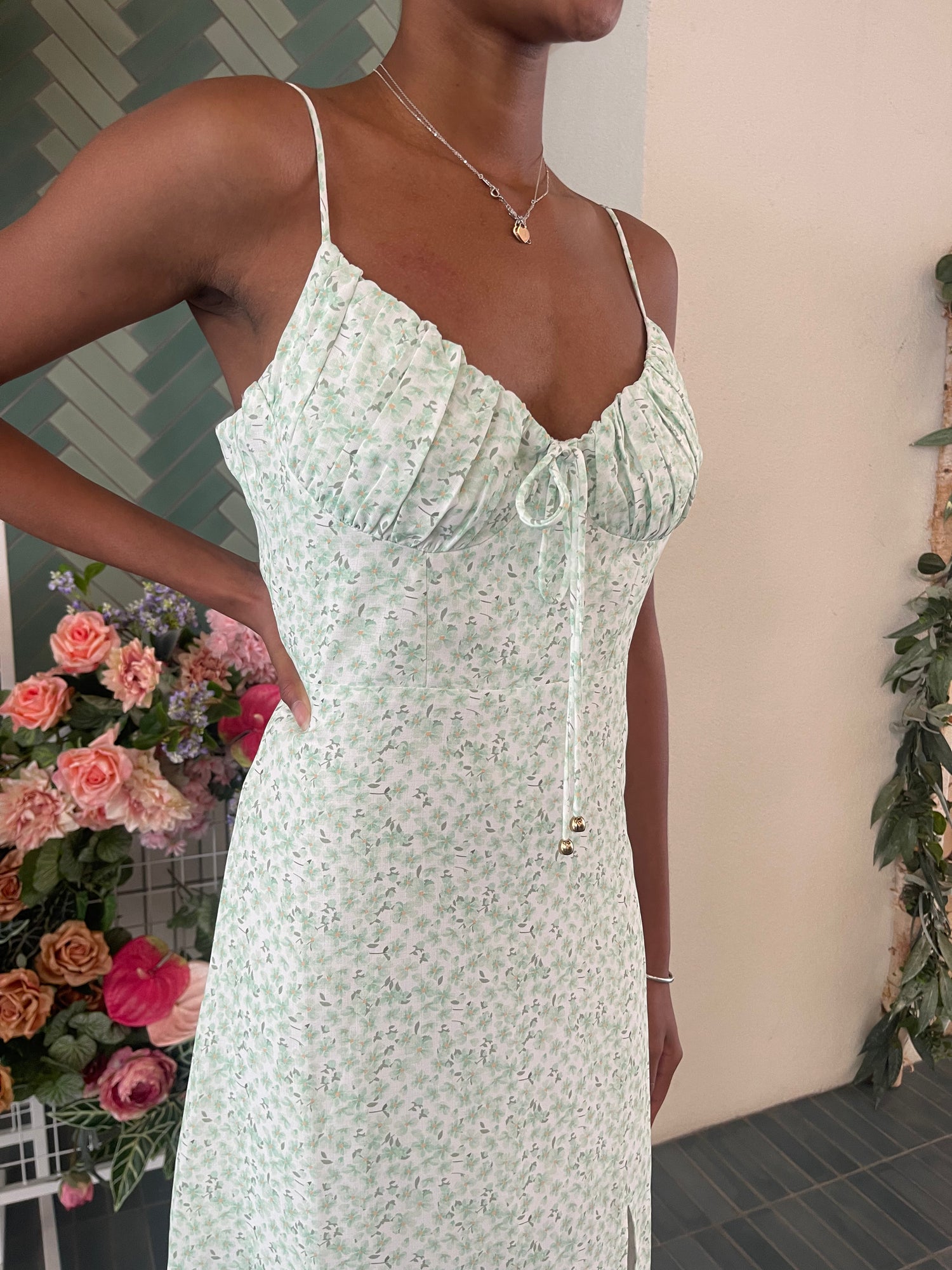 Mint floral maxi dress with a sweetheart neckline and bustier cups; featuring adjustable straps & a side zipper.